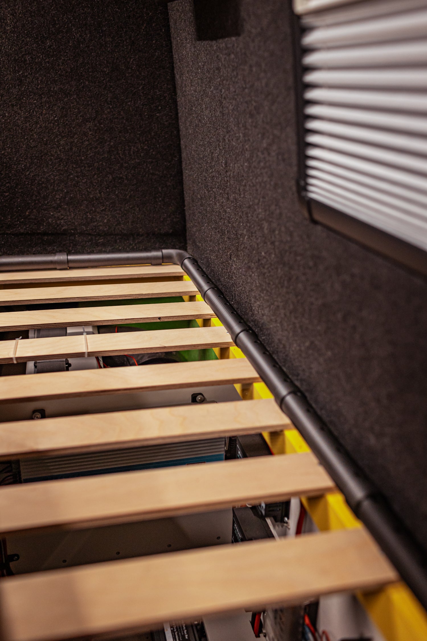 Schritt 2: Richte den Anschluss so aus, dass dieser unter dem Bettgestell herausragt und mit den Rohren verbunden werden kann.